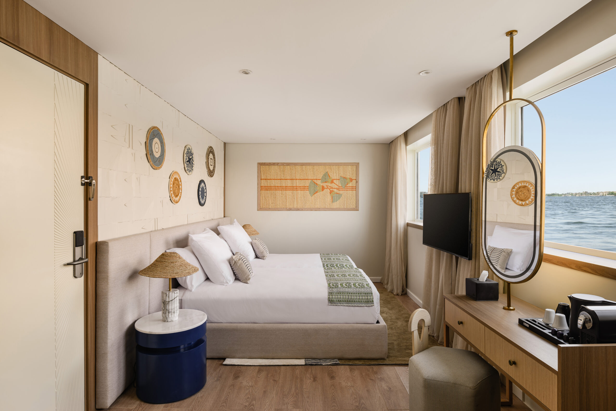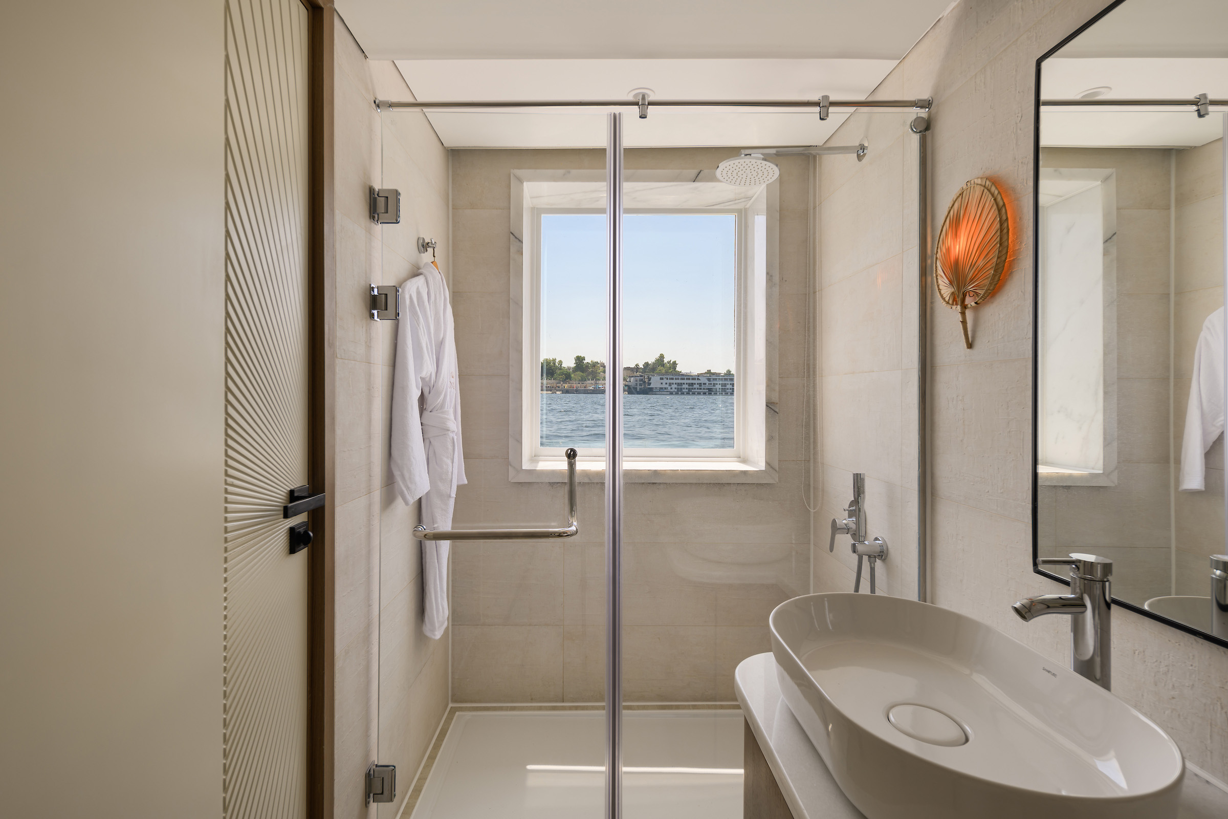 The Lumière Suite offers the ultimate experience on the Nile, combining space, comfort, and refined design. Elegantly furnished with sophisticated details and curated art pieces, the suite creates a luxurious environment to relax and enjoy the cruise. Generously proportioned, the suite features a large king bed, a spacious living area, a dining area, a jacuzzi, and windows on all sides, offering panoramic views of the surrounding scenery. Amenities include remote-controlled curtains, large flat-screen TVs with cable channels, a dedicated WiFi router for optimal connectivity, a fully stocked minibar, electronic safe, espresso machine with capsules, kettle with a selection of teas, laundry and room service, and dedicated butler service. With thoughtful design and attentive service at every turn, the Lumière Suite provides an unforgettable retreat on the Nile, where comfort, privacy, and elegance come together seamlessly.